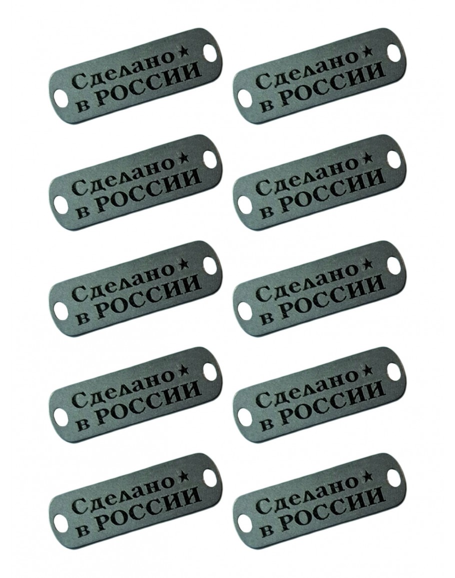 Шильдик матовый с гравировкой СДЕЛАНО В РОССИИ (размер 25х8х0,8 мм с двумя отв. 1,5х2,5 мм) используется для брендирования или как декоративный элемент при изготовлении корзинок, сумок, игрушек, при вязании или шитье и т.п., придаст любому изделию индивидуальность и законченность. Цена указана за один набор. В наборе 10 штук.